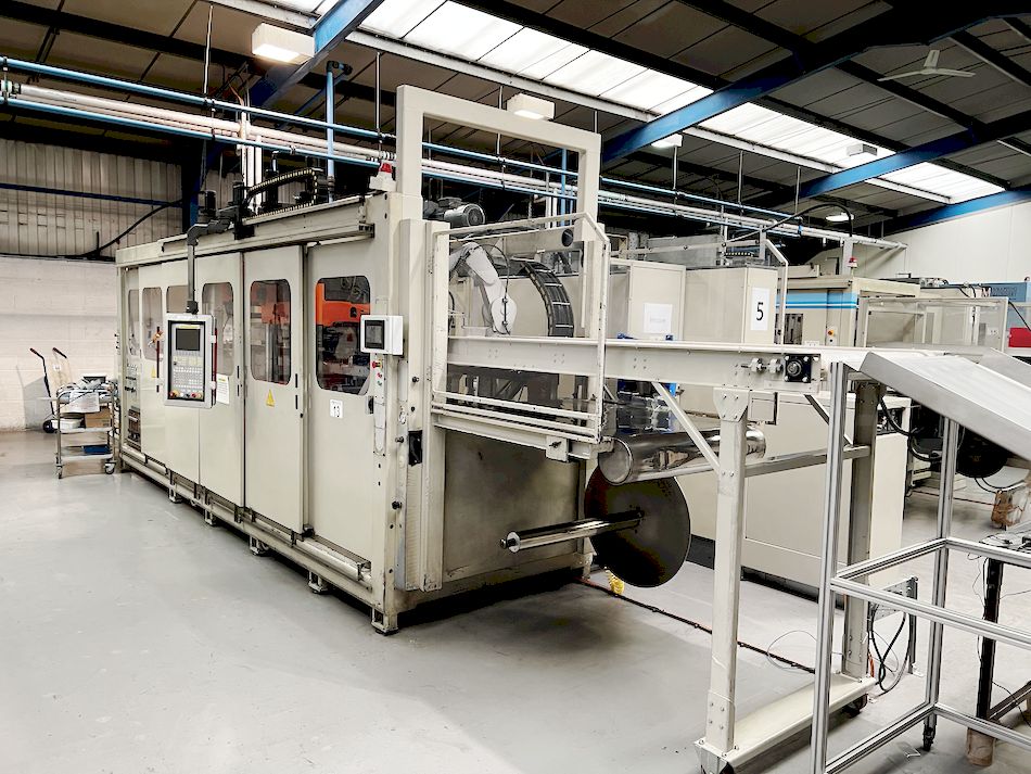 "WM Wrapping Machinery type FCS820 thermoforming machine; serial no. 185; year 2003. To include Mitsubishi electric model RV-7FLM-D1-S15 robot arm stacking unit, serial no. FG709004R, year 2017; automatic unwinder; stainless steel chute; control panel; scrap winder; in mould cut; max mould 820 x 570mm; mould depth upwards 150mm; mould depth downwards 150mm; approx. 12000kg weight; conveyor belt; with manual and selected spare components as lotted"