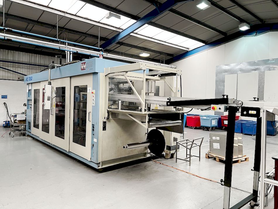 WM Wrapping Machinery type FC780E thermoforming machine; serial no. 453; year 2010. To include control panel; automatic unwinder system; up stacking unit with AB functionality; scrap rewinder; mould size 780 x 580mm; height upwards 130mm; height downwards 130mm; stainless steel chute; with manual and selected spare components as lotted
