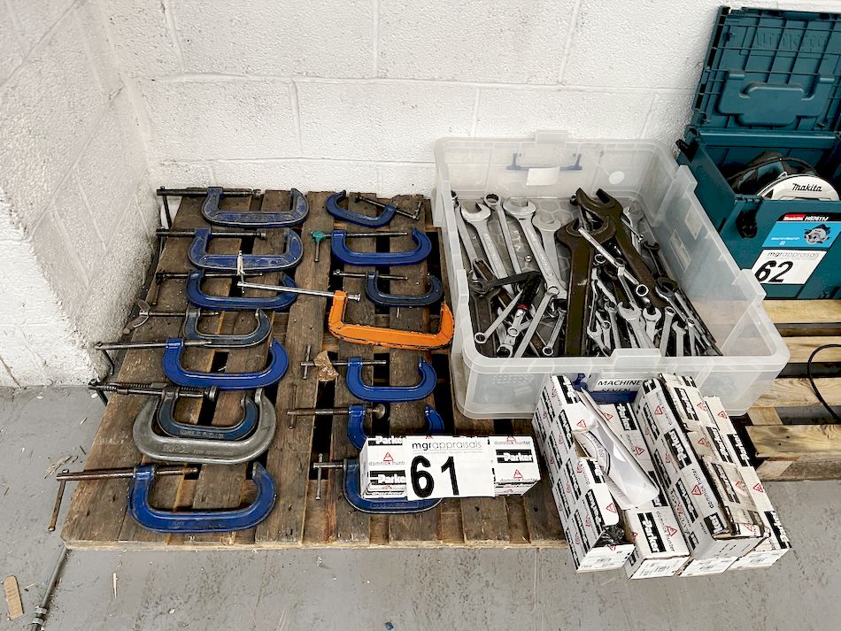 Pallet to include 15 G-clamps and box of various spanners