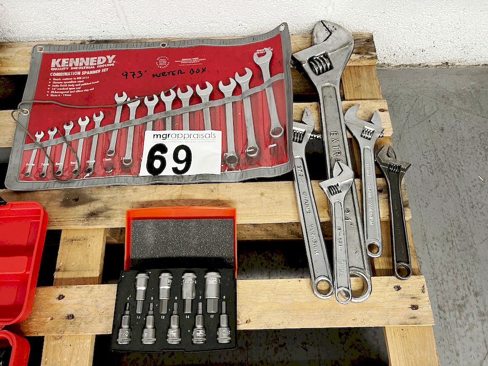 "Kennedy spanner set, 5 adjustable spanners, bacho 1/2 inch sockets"