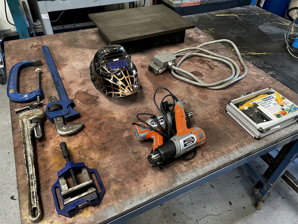 "Steel trolley to include engraver, 2 heat guns, clamps, welders mask and steel inspection table"