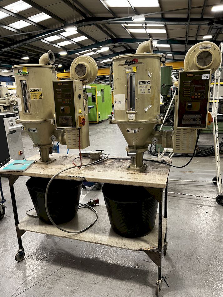 "2 Plastek model SHD25 hopper dryer, year 1998 and 1999 on bench"