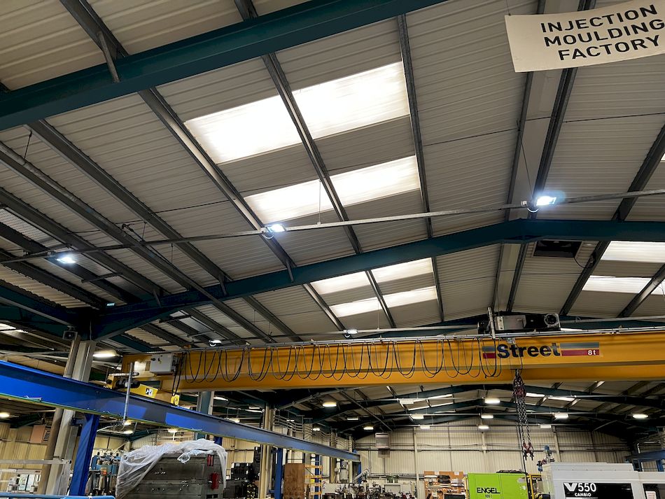 "Street twin beam overhead travelling crane with electric control hoist, 8t capacity, serial no. 1317501, year 2012, on freestanding track, c. 18m width x c. 42m length (To be removed after Friday 24 November 2023)"